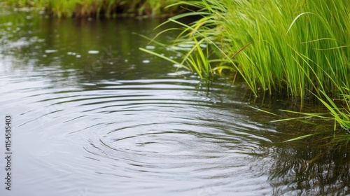 © EpicFade, Fototapeta premium Tranquil Water Surface with Gentle Ripples and Lush Green Grass Edges