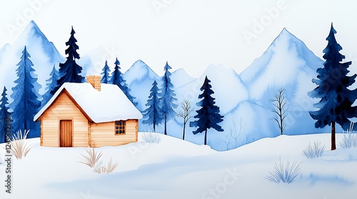 Naklejka premium Tranquil Watercolor of a Cozy Cabin in a Snowy Mountain Winter Landscape