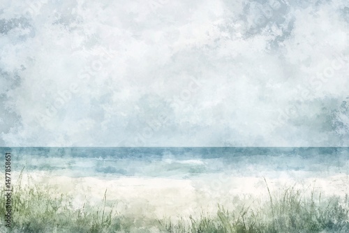 © Garis, Fototapeta premium Tranquil Watercolor Seascape with Lush Greenery – Serene Coastal Horizon and Soft Cloudy Sky