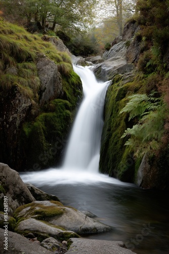 Fototapeta premium Tranquil waterfall cascade in lush forest setting with moss-covered rocks
