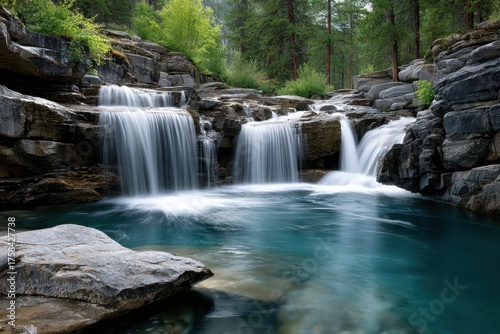 © YouraPechkin, Fototapeta premium Tranquil Waterfall Cascading into a Clear Turquoise Pool