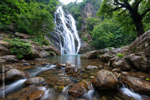 Fototapeta premium Tranquil Waterfall Cascading into Rocky Stream in Lush Forest