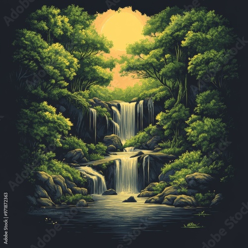 Naklejka premium Tranquil Waterfall in Lush Forest with Sunset Glow