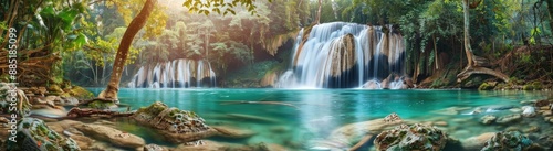 © Horsi, Obraz premium Tranquil Waterfall in Lush Tropical Forest