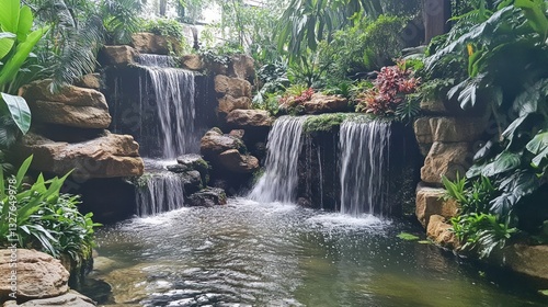 Naklejka premium Tranquil Waterfall Scene Amid Lush Tropical Foliage