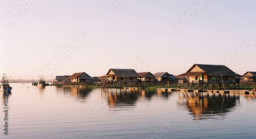 © Anindito, Fototapeta premium Tranquil waterfront huts reflected in a calm lake at dawn.