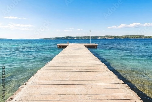 © muhrohan, Obraz premium Tranquil Waters and Wooden Pier Stretching Out to a Beautiful Clear Horizon