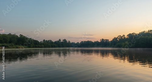 © LoFi J., Fototapeta premium Tranquil Waters, Green Horizons. A Quiet Lakeside Scene at the Break of Dawn.