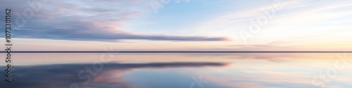 Fototapeta premium tranquil waterscape at dusk, expansive sky mirrored in still waters, layered clouds, subtle color gradient, horizon silhouette, high-definition photography