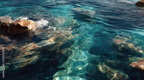 Obraz premium Tranquil Waterscape: Sunlit Reflections on Azure Sea with Coastal Rocks