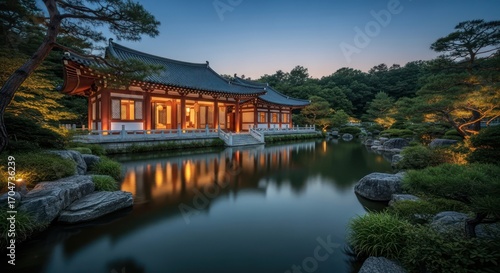 © nia, Fototapeta premium Tranquil waterside temple architecture illuminated at twilight landscape scenery