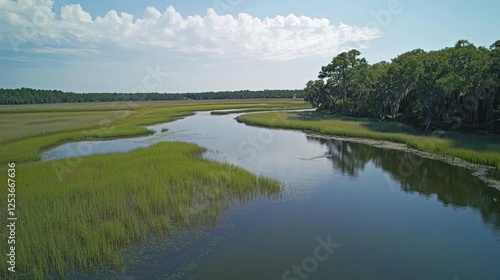© adha, Obraz premium Tranquil Waterway meandering Through the Green Coastal marshland with trees