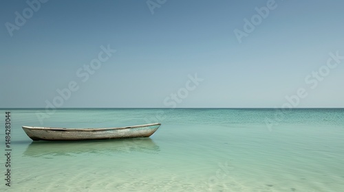 Naklejka premium Tranquil, weathered boat floats on a serene, shallow sea