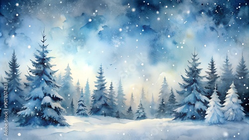 Naklejka premium Tranquil Winter Forest Scene: Snow-covered Pine Trees in Watercolor Style Painting, Serene Landscape with Falling Snowflakes, Cool Blues and Whites Creating Chilly Atmosphere of Calm Snowy Day
