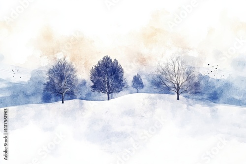 Obraz premium Tranquil winter landscape with snow-covered trees and soft watercolor sky