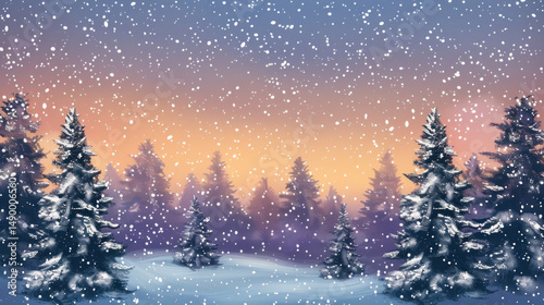 © Alleuy, Naklejka premium Tranquil winter snowfall scene snow covered trees and soft orange sky