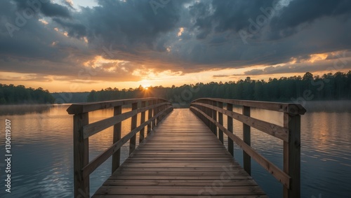 © Giovanni, Fototapeta premium Tranquil Wooden Bridge Over Serene Lake at Sunset After Storm with Dramatic Sky and Reflection in Calm Waters