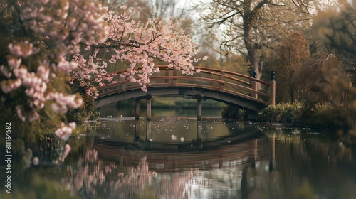 Obraz premium Tranquil wooden bridge over serene pond surrounded by blossoming cherry trees