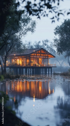 Fototapeta premium Tranquil wooden cabin on a serene lake at dawn