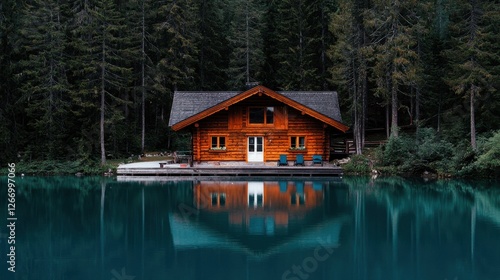 Fototapeta premium Tranquil Wooden Cabin Reflected in Serene Blue Lake Surrounded by Lush Green Forest
