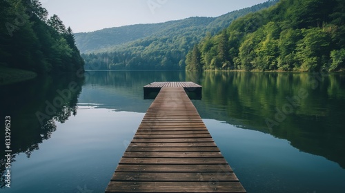© Татьяна Евдокимова, Fototapeta premium Tranquil wooden dock leads the eye out to a calm, glassy lake surrounded by lush green forested hills under a soft sky