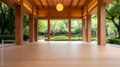 © Nadiyah, Obraz premium Tranquil wooden pavilion garden view, peaceful outdoor space, Japanese-style architecture, perfect for relaxation