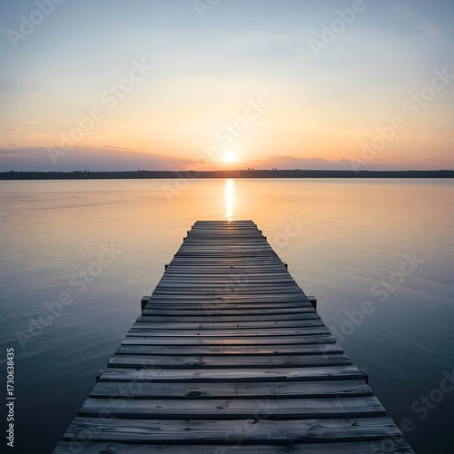 © Shamim, Naklejka premium Tranquil wooden pier leads to a serene sunset over a calm lake landscape at dawn