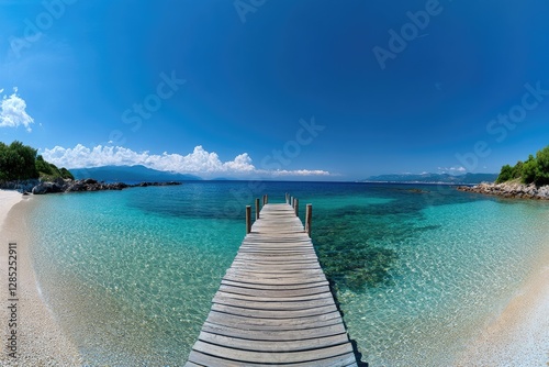 © Nadyah, Obraz premium Tranquil wooden pier leads to turquoise beach cove, sunny sky