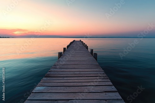 © Kawasan, Fototapeta premium Tranquil wooden pier stretches into a serene sunrise/sunset over calm water