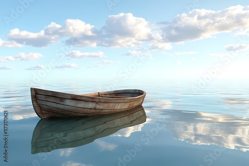 © Rahnumas, Fototapeta premium Tranquil Wooden Rowboat on Calm Water Under a Cloudy Sky