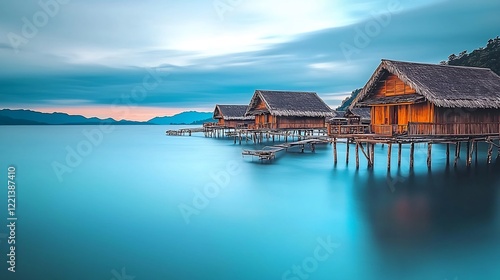 © samback, Fototapeta premium Tranquil wooden stilt houses over calm turquoise water with a mountain backdrop