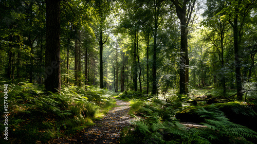 © Beulah, Fototapeta premium Tranquil Woodland Escape: A Sun-dappled Forest Path Through Lush Green Trees and Whispering Leaves