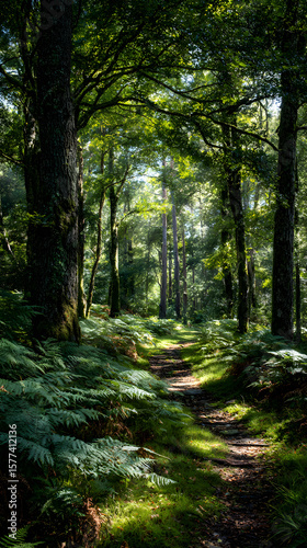 Fototapeta premium Tranquil Woodland Escape: A Sun-dappled Forest Path Through Lush Green Trees...