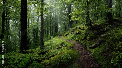© Mykola, Obraz premium Tranquil woodland landscape bathed in dappled light among fresh foliage and a winding path