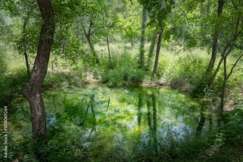 © Sai, Obraz premium Tranquil woodland pool, lush greenery, mirrored reflections