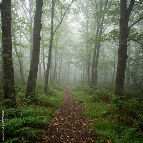 © Chris, Naklejka premium Tranquil Woodland Scene with Sunlight Filtering Through Trees