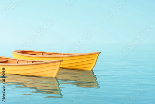 © Purple_Lamp, Naklejka premium Tranquil Yellow Rowboats Floating on Serene Blue Water