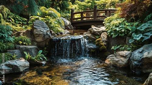 © Kristian, Fototapeta premium Tranquil Zen Garden: Serenity and Escape Amidst a Peaceful Rock Waterfall, Lush Greenery, and Wooden Bridge
