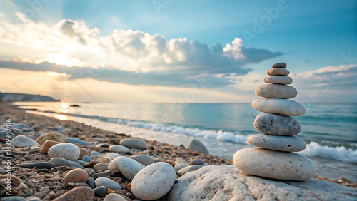 Fototapeta premium Tranquil Zen Stones on Serene Beach Under Soft Ocean Sky
