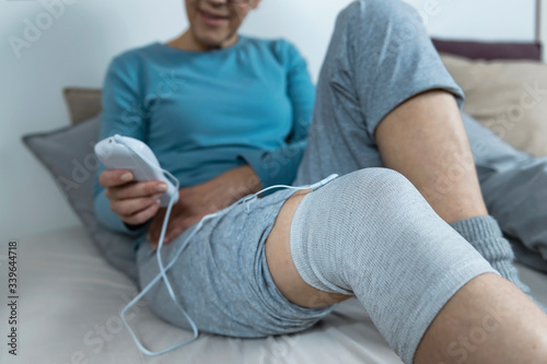 Fototapeta premium Transcutaneous Electrical Nerve Stimulation, Senior Woman Doing Knee Physical...
