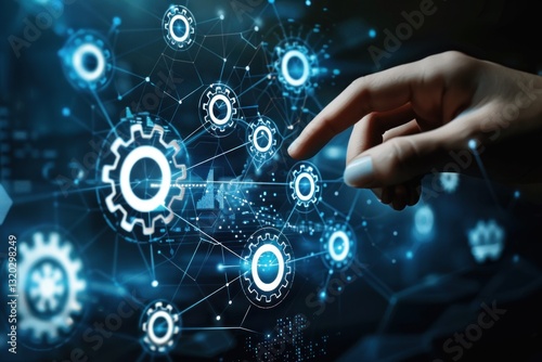 © waranyu, Obraz premium transfer data between application, closeup hand touching gears icon on network