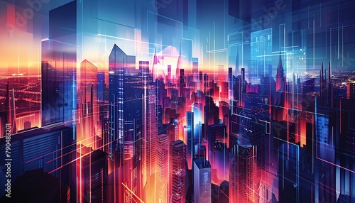 Fototapeta premium Transform a futuristic cityscape into a sleek vector graphic masterpiece, highlighting sleek lines and geometric shapes in a photorealistic style