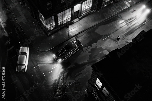 © wasan, Fototapeta premium Transform ordinary movie scenes into captivating noir masterpieces from above Embrace the timeless allure of film noir by incorporating iconic elements such as femme fatales,