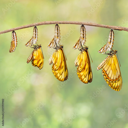 © mathisa, Naklejka premium Transformacja żółtego motyla coster (Acraea issoria) z gąsienicy i poczwarki wiszącej na gałązce