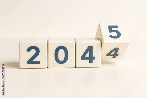 © Pixels Hunter, Obraz premium Transition from 2024 to 2025 shown with rotating cubes on a light background, symbolizing new year and future change concept for business planning.