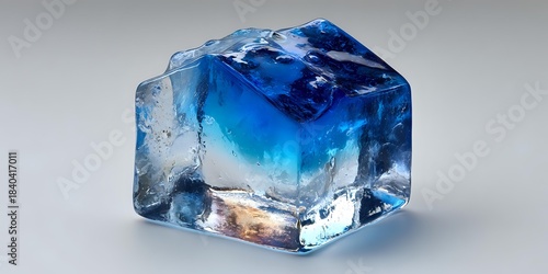 Obraz premium Translucent blue ice cube with frozen bubbles and crystal clear edges on...