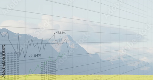 Obraz premium Translucent grid overlaying mountain meadow, tracing black and green graphs...