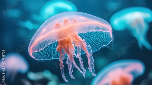 Fototapeta premium Translucent jellyfish glows softly in the ocean's depths, surrounded by a...