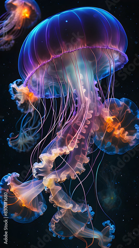 © pla2u, Naklejka premium Translucent jellyfish pulsate in the blue sea or black aquarium.