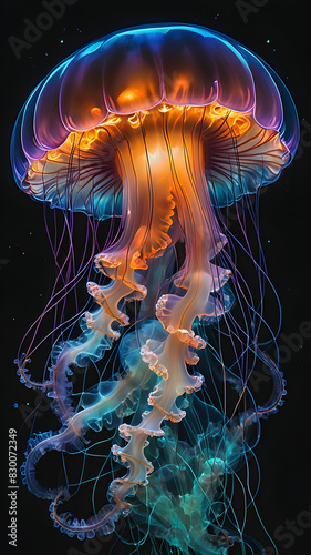© pla2u, Naklejka premium Translucent jellyfish pulsate in the blue sea or black aquarium.
